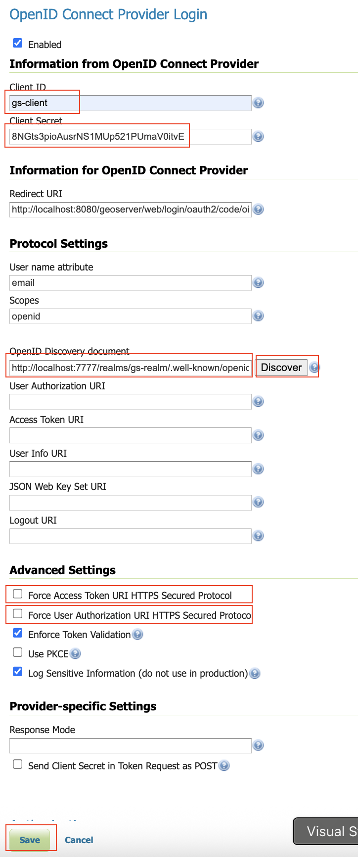 - Press "Discover" (this will download OIDC metadata from your keycloak client)