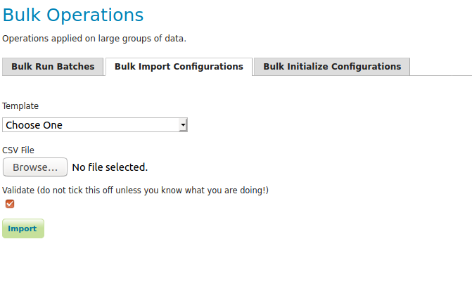 The task manager provides a number of bulk operation tools via an additional page in the GUI. The import tool is also available via a REST service.