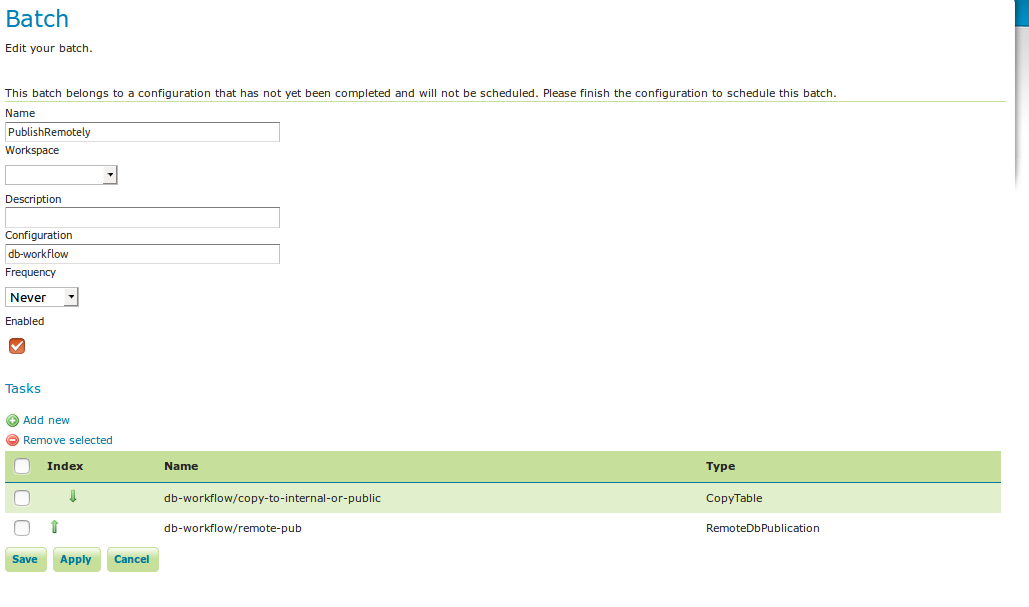 Batches can be created and edited from here as well, however the configuration must exist in order to be able to do that (in case of a new configuration, you must click apply once before you can create new batches). New tasks must also be saved (again, via the apply button) before they can be added to a batch. In case that the conditions are met, batch runs can be started, and the status/history of current and past batch runs can be displayed. Current batch runs can be interrupted (which is not guaranteed to happen immediately).