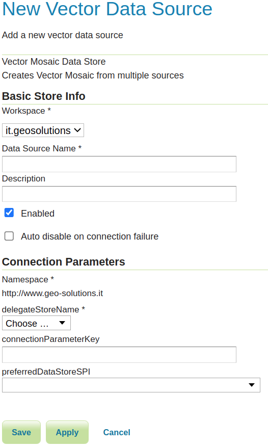 Data Source Name- Name of the Vector Mosaic Store as it will be known to GeoServer.