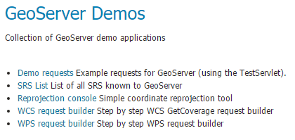 This page has example WMS, WCS, and WFS requests for GeoServer that you can use, examine, and change. Select a request from the drop down list.