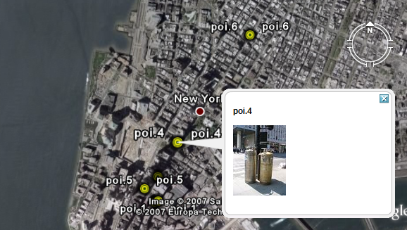 In KML a "Placemark" is used to mark a position on a map, often visualized with a yellow push pin. A placemark can have a "description" which allows one to attach information to it. Placemark descriptions are nothing more than an HTML snippet and can contain anything we want it to.