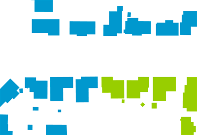 Spatial filters can also be used to compare layer geometries against arbitrary geometries, not just bounding boxes. In this example, the within filter is used to select all buildings inside a triangular region defined using Well-Known Text (WKT) and color them green. All other features are colored blue:
