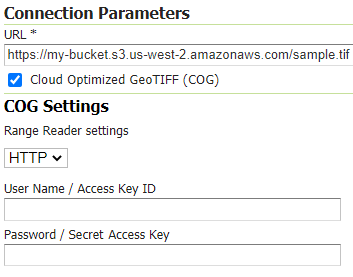 | User Name / Access Key ID / Account Name | Optional user name (HTTP) or Access Key ID (S3) or Account Name (Azure) in case the COG dataset requires authentication |