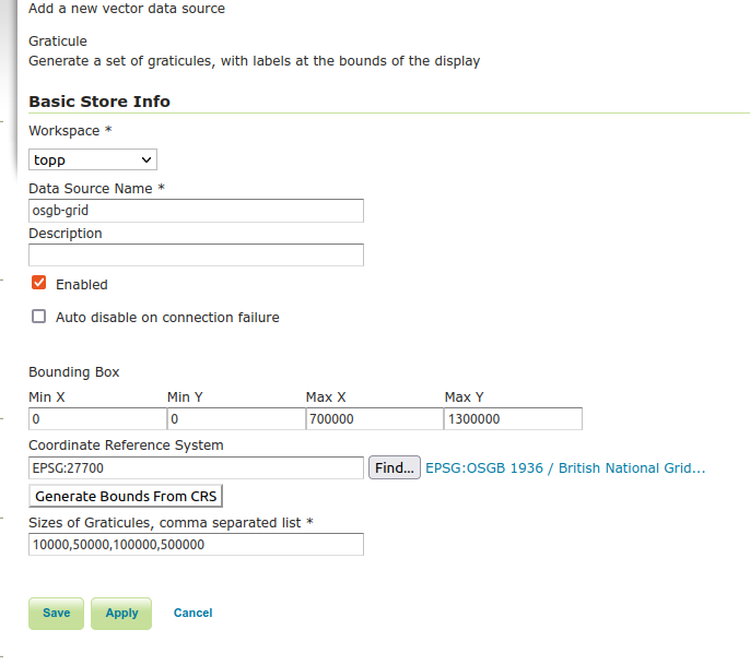 A new graticule store is created by providing a name, optional description and the a bounding box (which can be calculated automatically from the CRS), a Coordinate Reference System and a series of steps separated by commas.
