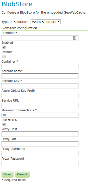 Once the plugin has been installed, one or more Azure BlobStores may be configured through BlobStores. Afterwards, cached layers can be explicitly assigned to it or one blobstore could be marked as 'default' to use it for all unassigned layers.
