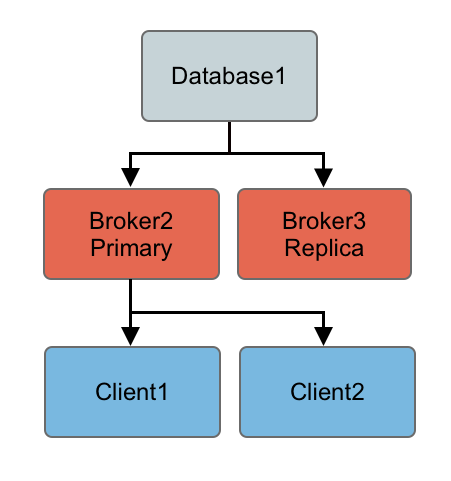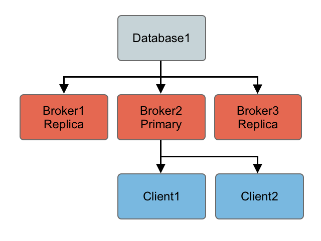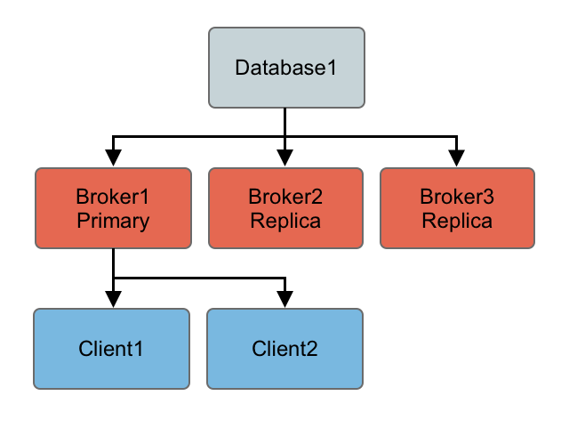 When using just JDBC as the data source you can use a Primary/Replica approach, running as many brokers as you wish as this diagram shows. On startup one primary grabs an exclusive lock in the broker database - all other brokers are replicas and pause waiting for the exclusive lock.