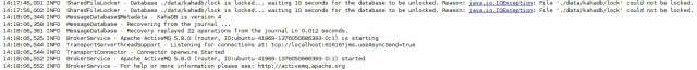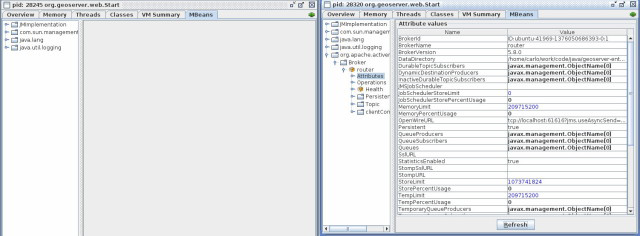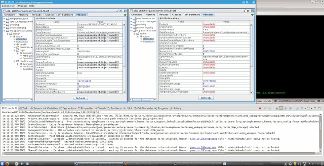 Doing so, the first broker instance will stop and the JMX connection will be closed, and the second instance (on the right side) will keep the control of the DB.