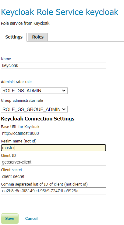 Administrator RoleandGroup administatorrole dropdown should be empty at the beginning. They can be filled once saved the role service with the Keycloak role that we want to map to the GeoServer ADMIN and GROUP ADMIN.