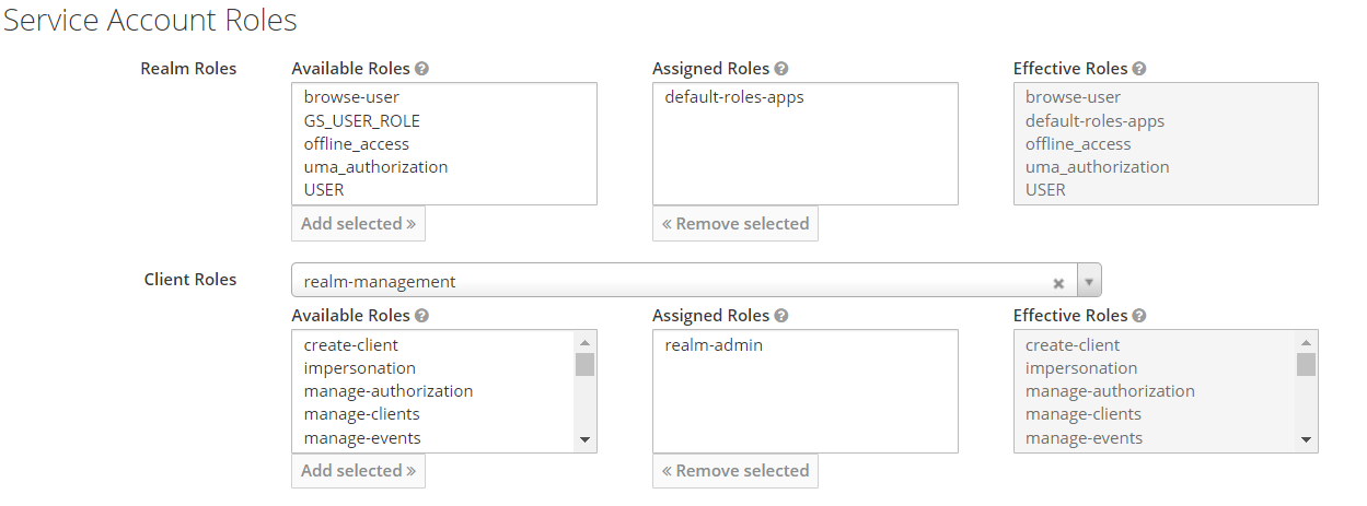 Service Account Rolestab, ensure that the realm-admin, from the realm-management client role is addedd to theAssigned roles.