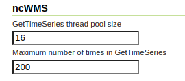 | Maximum number of times in GetTimeSeries | Maximum number of times tha GetTimeSeries will process. A user asking for more times will get back a service exception. The configuration is set the first time the admin hits save in the WMS page, even with a value of 0 (from that point on, GetTimeSeries will be independent on the WMS max dimensions setting). |