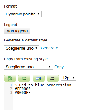 A new "Dynamic palette" style format has been added that accepts a palette, one color per line, defining a color progression to be applied on raster data. Each color can be defined using these possible syntaxes (same as ncWMS):