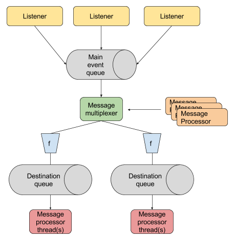 Each message is combined with its processor and send into a destination queue, where a thread pool picks the events and runs their processor. For some type of events, like catalog ones, the thread pool will have to be configured with just one thread to make sure the events are sent in the right order to the destinations.