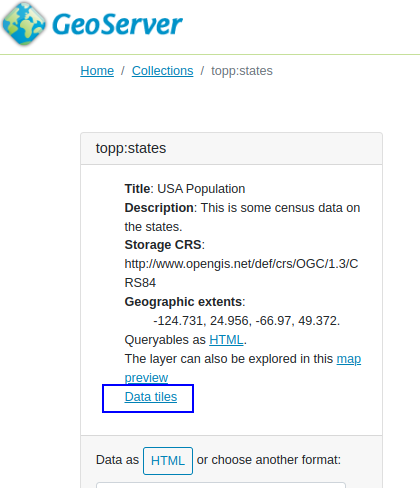 - Collections with vector tiles enabled will have a "data tiles" link pointing at the tiles endpoint
