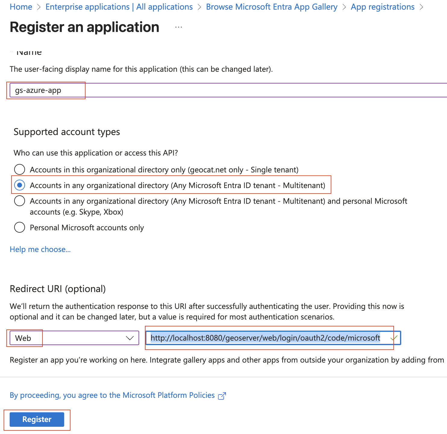 Give the application a name ("gs-azure-app"), set it to the MultiTenant. Use "http://localhost:8080/geoserver/web/login/oauth2/code/microsoft" as the "Web" Redirect URI. Press "Register".