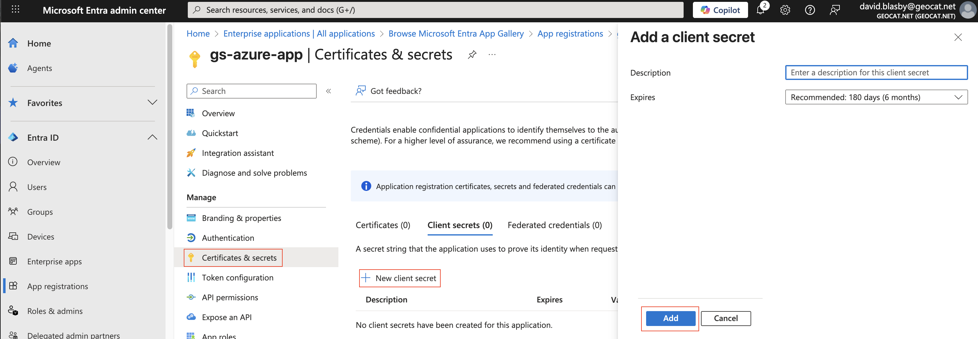 On the app summary screen, press "Certificates & Secrets", "+ New client secret", then press "Add".