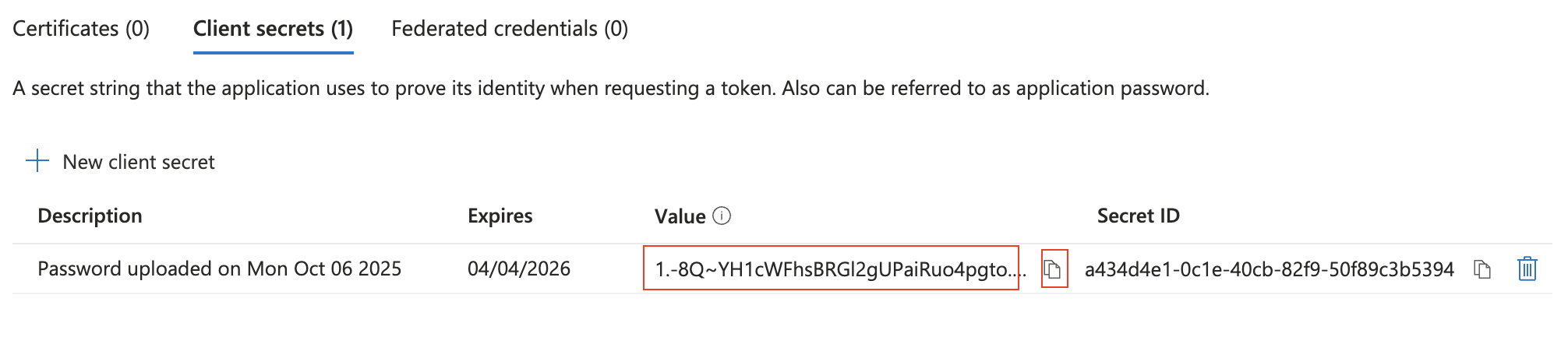 Make sure you copy-and-paste the created Client Secret - you will need this later and you can only access now. Ensure you got the "Value" (not the ID).