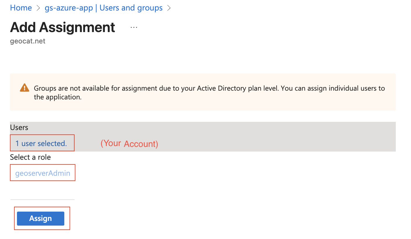 Press "Enterprise Apps" (far left column), choose your application ("gs-azure-app"), and press "Assign users and groups".