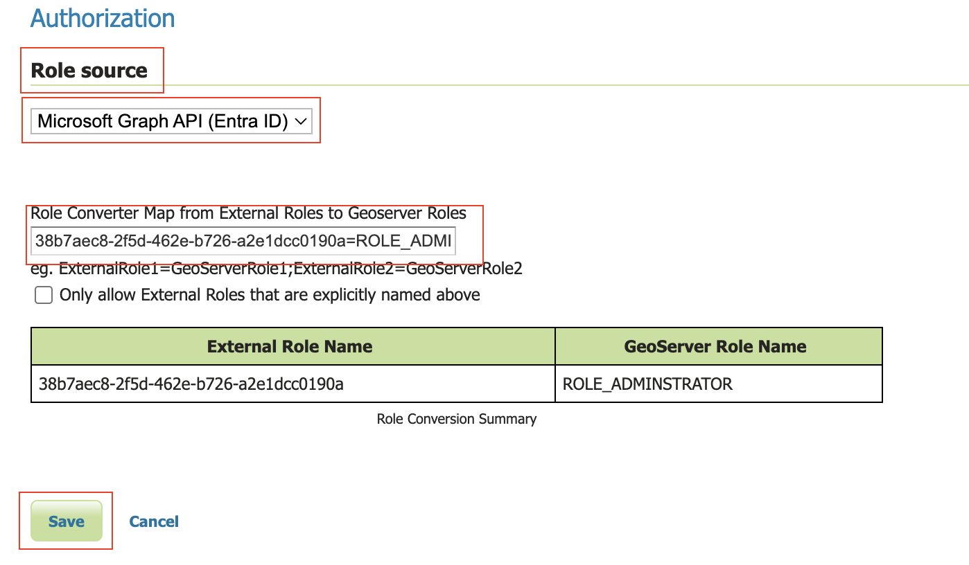 - Turn on "Get Roles from the User's Application Roles (MSGraph appRoleAssignments endpoint)". GeoServer will retrieve the user's roles from the MSGraph's "appRoleAssignments". These roles are the Role ID (GUID) not the name of the role.