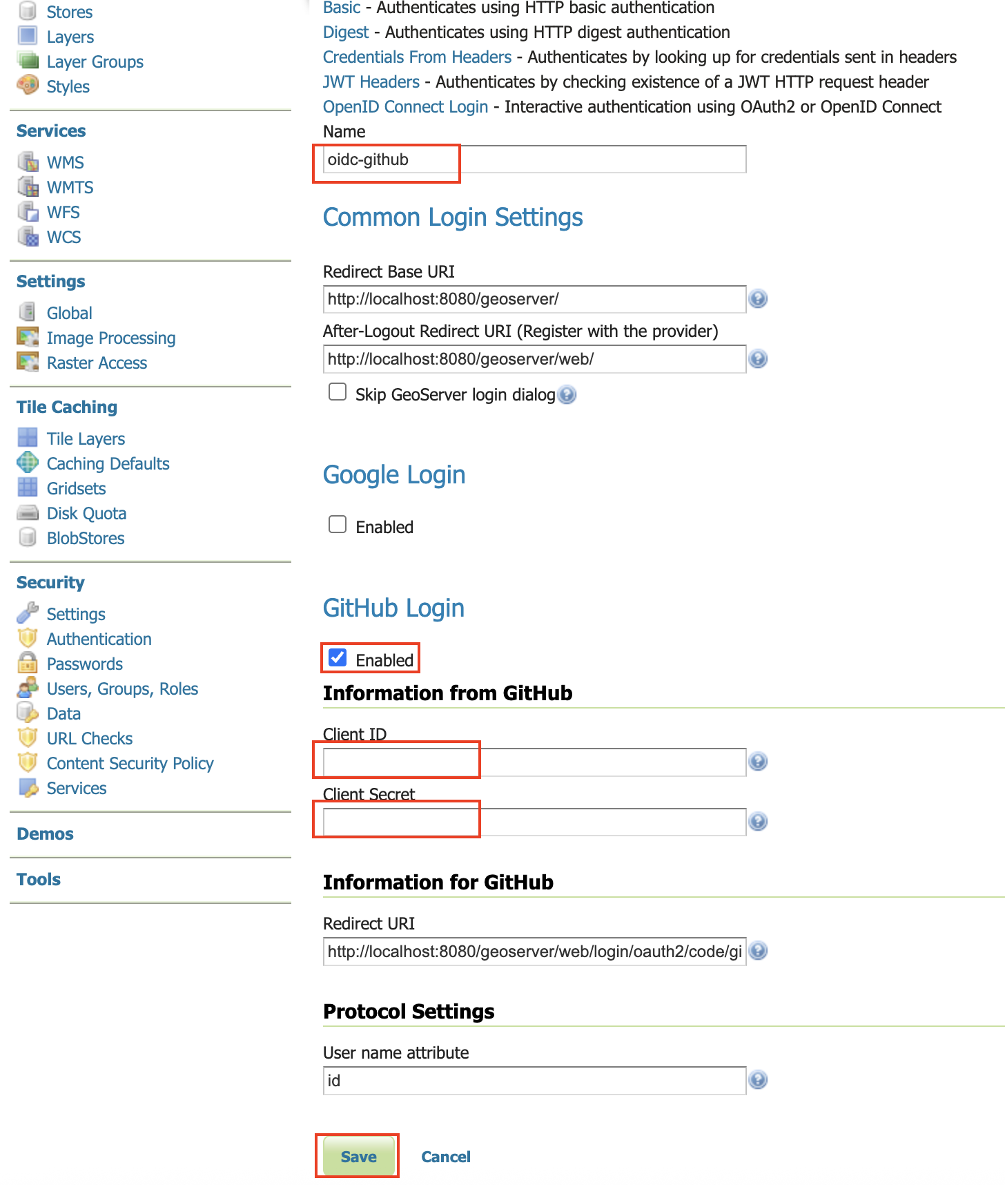 - The authorization callback in the form of "http://localhost:8080/geoserver/web/login/oauth2/code/gitHub"