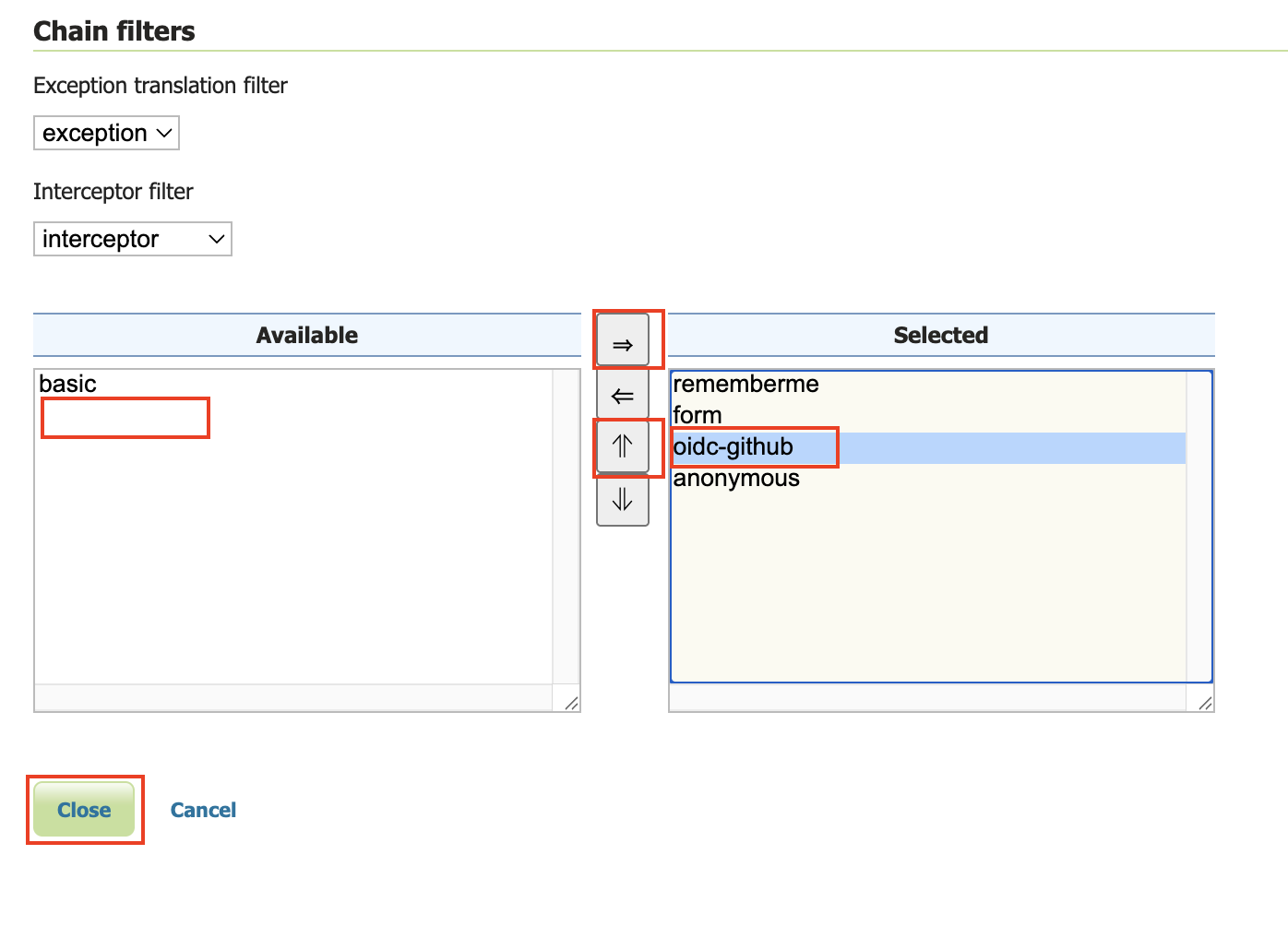 - Move the new GitHub OIDC Filter above "anonymous" by pressing the up arrow button (See above diagram).