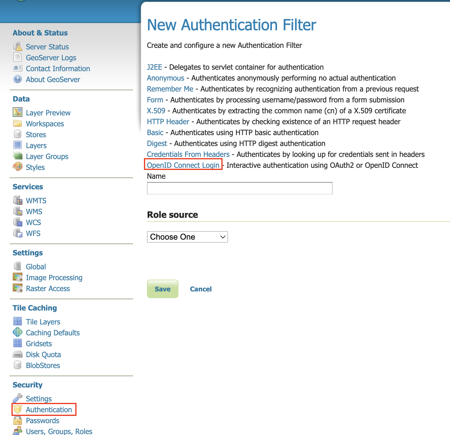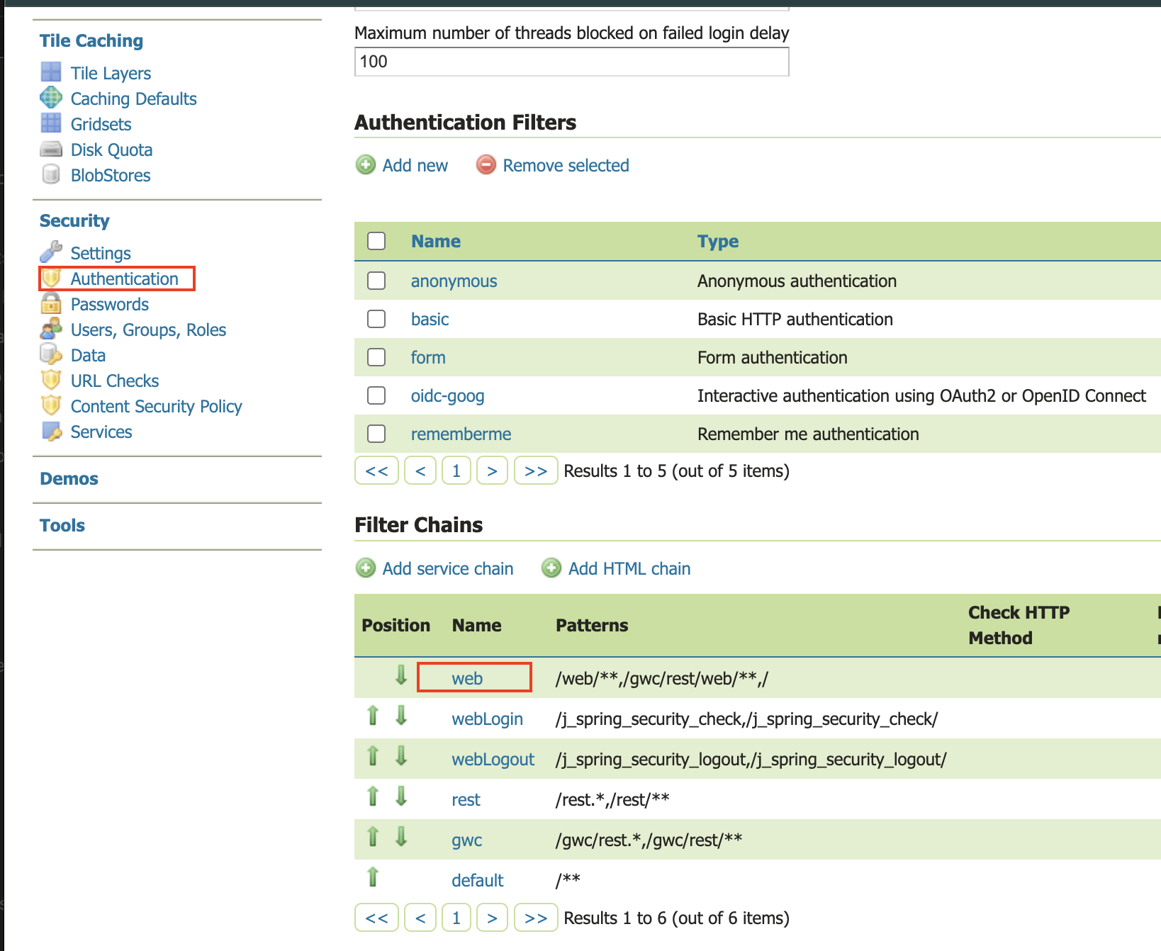 - On the left bar under "Security", click "Authentication", and then click "Web" under "Filter Chains"