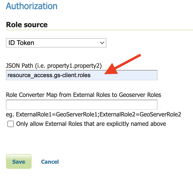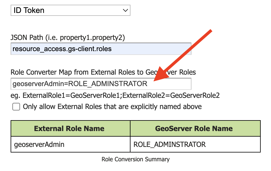 If you turn on the "Only allow External Roles that are explicitly named above", then roles that are not mentioned in the Role Converter Map will not be in the set of GeoServer roles. For example, in the example ID Token, the user has role "geoserverAdmin" and "geonetworkAdmin". If this is not turned on, then the user will have the GeoServer roles "ROLE_ADMINISTRATOR" (translated from "geoserverAdmin") as well as "geonetworkAdmin". If it is turned on, then they will only have the "ROLE_ADMINISTRATOR" (translated from "geoserverAdmin") role.
