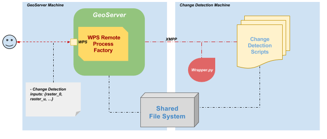 The illustration shows a deploy diagram of a Change Detection executable running on a remote machine and exposed as a GeoServer WPS Process thought the WPS Remote Plug-in.