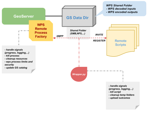 The illustration below shows the interaction between the GeoServer Remote WPS plug-in and the Python framework wrappers. The whole communication is achieved through the XMPP protocols. The Python framework makes available a set of scripts and wrappers allowing to invoke the external executables and manage the entire execution by translating commands and outputs into XMPP messages to be sent and received by GeoServer.