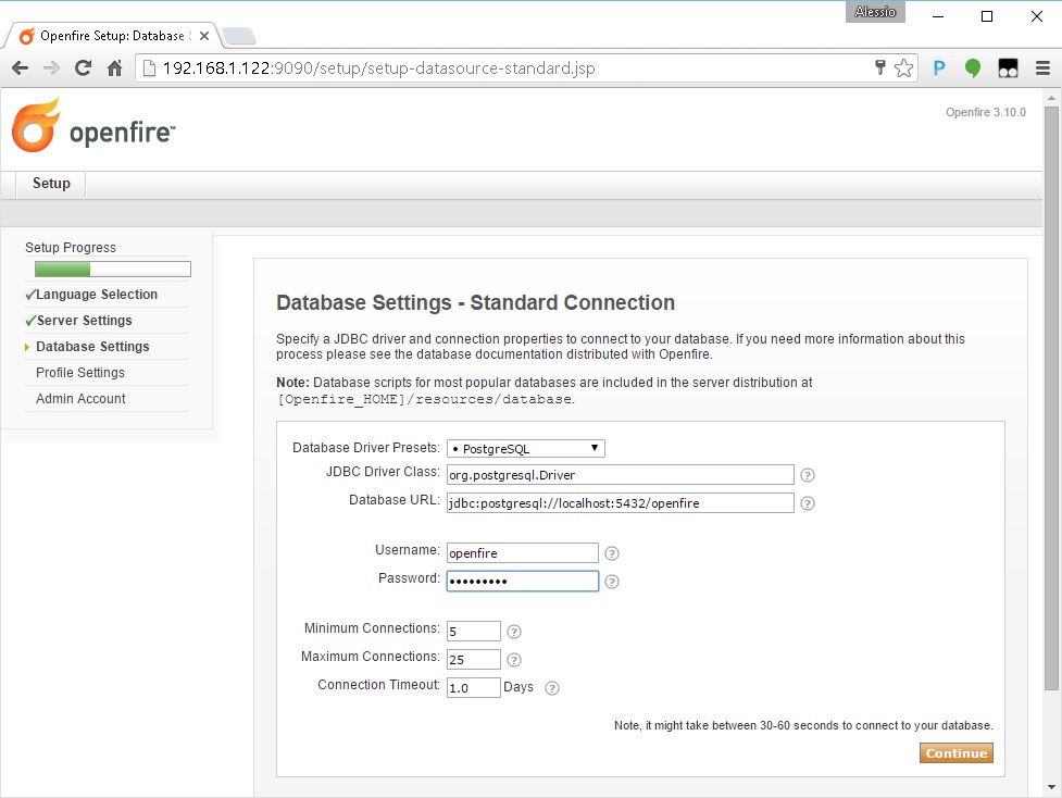 Be sure the openfire database and user have been correctly created on PostgreSQL and the passwords provided (see above for instructions).