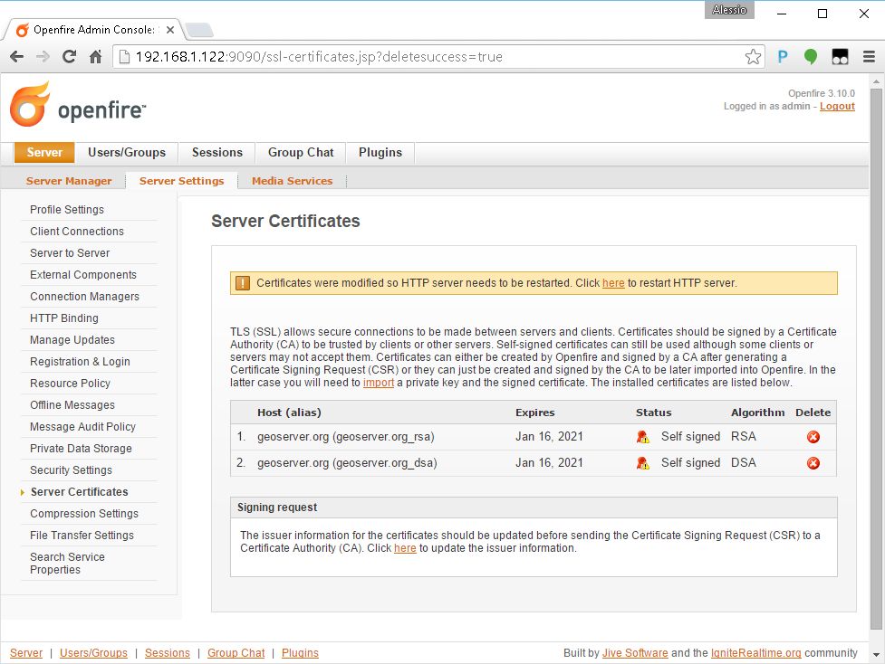 Make sure that the self-signed certificates have been correctly generated and click on here in order to restart the server
