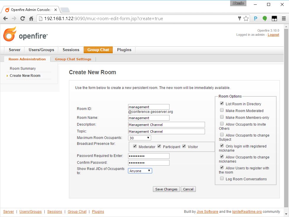 Create the management channel as shown in the next figure. Pay attention to the Room Options and specify the password for the channel
