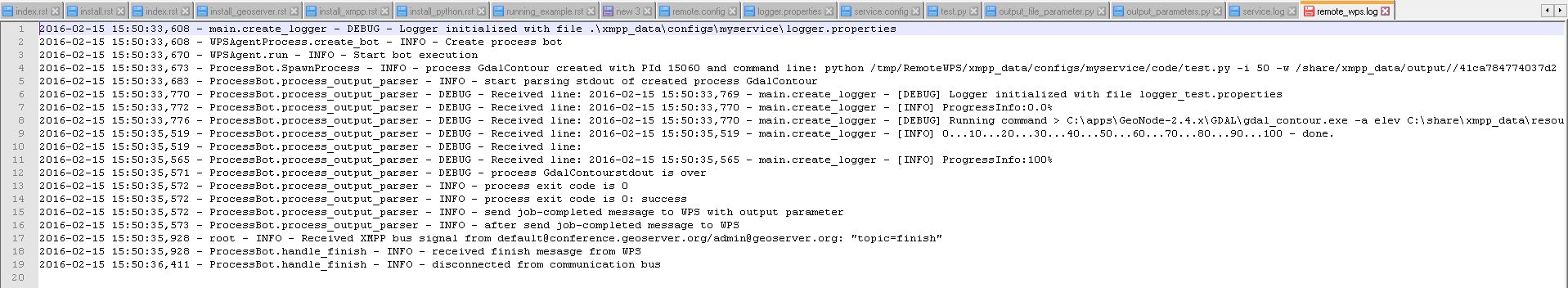 From the log file is possible to recognize the full command line executed by the Remote WPS Python wrapper along with the lines received through the standard output