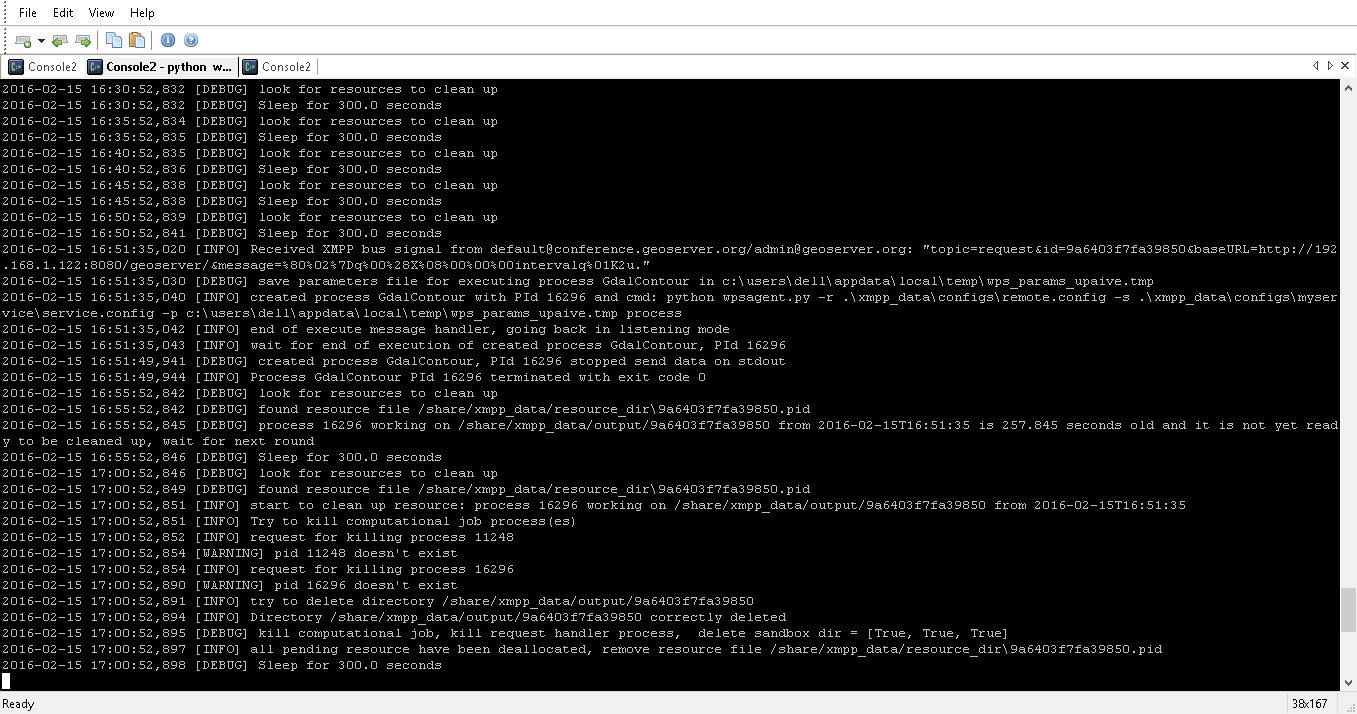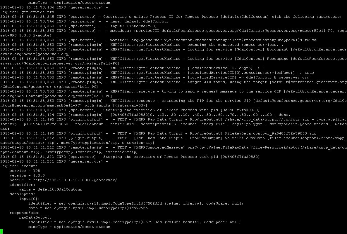 On GeoServer side, it is possible to follow the process execution by following the messages sent via XMPP to the GeoServer logs