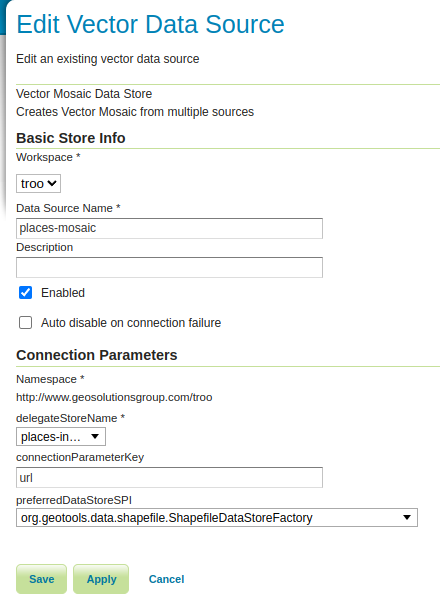 The delegate datastore can be in any format that GeoServer supports but there are two required fields: