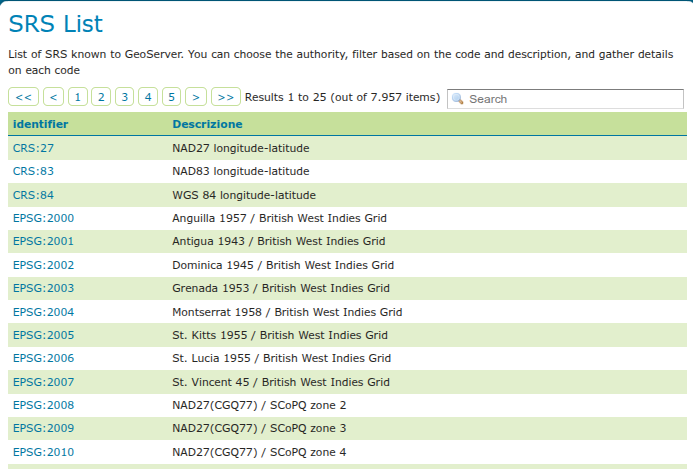 Listing of all Spatial Referencing Systems (SRS) known to GeoServer