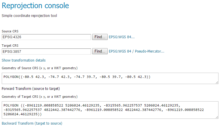 For example, you can use the reprojection console to transform a bounding box (as a WKT polygon or line) between different CRSs.