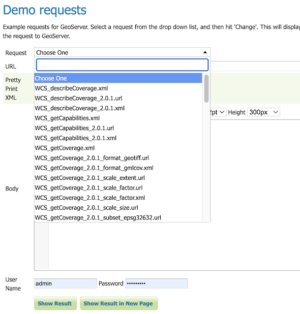 This page has example WMS, WCS, and WFS requests for GeoServer that you can use, examine, and change. Select a request from the drop down list.