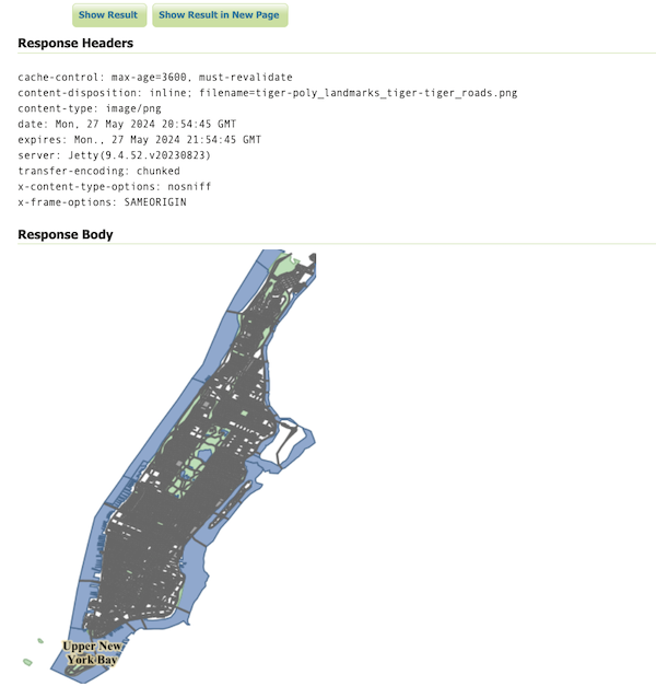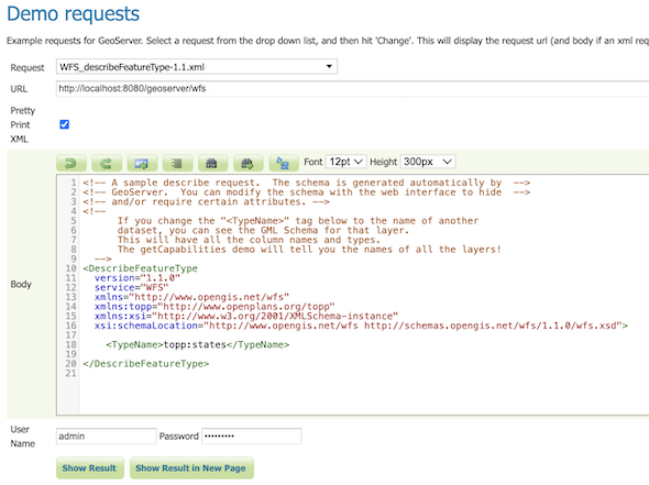Show Result will show GeoServer's response - both the response headers and the XML/image result - below the Show Result button. If GeoServer's response is XML and you have ticked Pretty Print XML, GeoServer's response will be shown with an easy to read styled formatting.