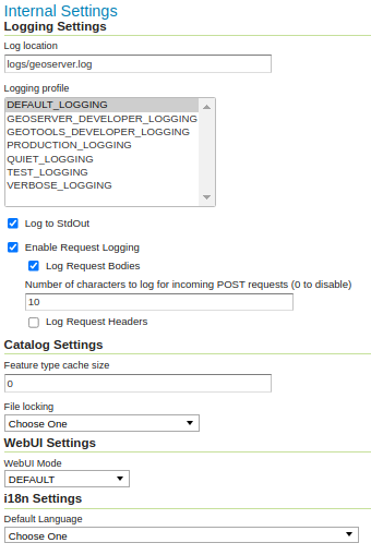 - Number of characters to log for incoming POST requests: In more verbose logging levels, GeoServer will log the body of incoming requests. It will only log the initial part of the request though, since it has to store (buffer) everything that gets logged for use in the parts of GeoServer that use it normally. This setting sets the size of this buffer, in characters. A setting of 0 will disable logging the body of the request.