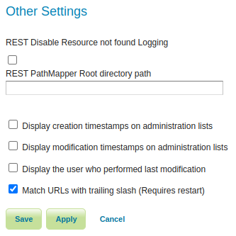 This setting determine whether GeoServer matches URLs whether or not the request has a trailing slash. If enabled a request mapped to "/ogc/collections" also matches "/ogc/collections/". A restart is required for a change to this setting to take effect.
