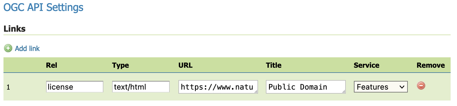 The collections resource can have a number of additional links, beyond the basic ones that the service code already includes. Navigate to *Settings > Global. The links are configured under heading **OGC API Settings**. .. code-block:: raw_markdown  *Links used to indicate global Creative Commons license* Link editor column description: * **rel**: the link relation type, as per the OGC API - Features specification * **Mime type**: the mime type for the resource found following the link * **URL**: the link URL * **Title**: the link title (optional) * **Service**: the service for which the link is valid (optional, defaults to all) Common links relationships that could be added for thecollectionsresource are: *enclosure, in case there is a package delivering all the collections (e.g. a GeoPackage, a ZIP full of shapefiles). *describedBy, in case there is a document describing all the collections (e.g. a JSON or XML schema). *license, if all collection data is under the same license. Example from OGC API - Features service (http://localhost:8080/geoserver/ogc/features/v1/collections/?f=application%2Fjson): .. code-block:: json { "href": "https://creativecommons.org/licenses/by/3.0/", "rel": "license", "type": "text/html", "title": "Creative Commons - Attribution" } Custom links for workspace collections ^^^^^^^^^^^^^^^^^^^^^^^^^^^^^^^^^^^^^^ Additional customcollectionslinks can also be defined for an individual workspace. Navigate to ****Workspaces > Edit Workspace. Links are configured on the *Basic Info tab.