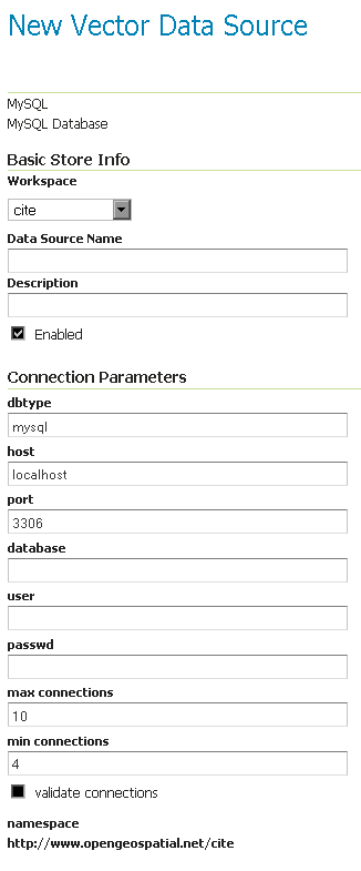 GeoServer does not come built-in with support for MySQL; it must be installed through an extension. Proceed to Installing the MySQL extension for installation details.