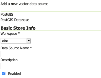 As with all formats, adding a PostGIS connection to GeoServer involves adding a new store to the existing Stores through the Web administration interface.
