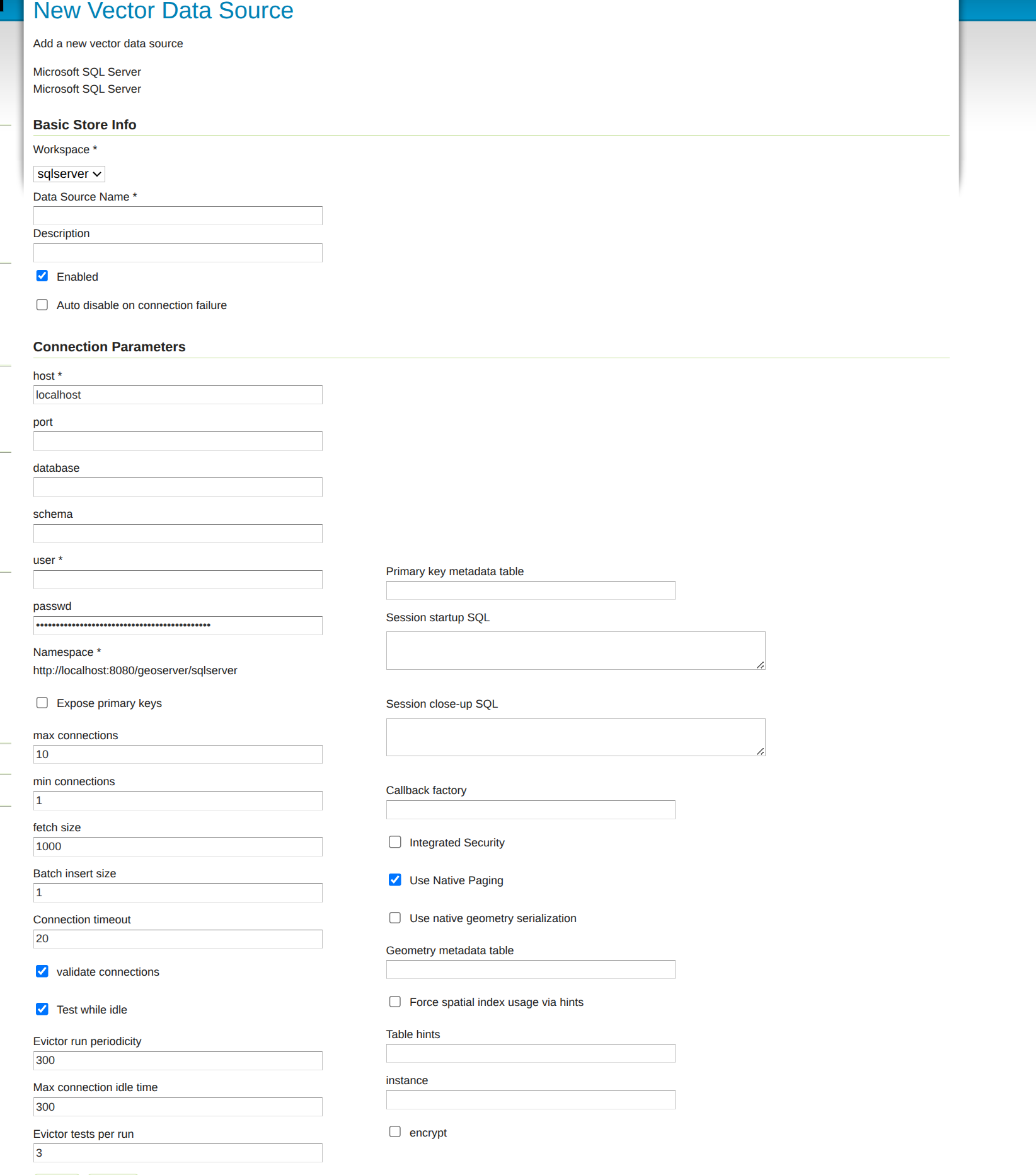 GeoServer does not come built-in with support for SQL Server; it must be installed through an extension. Proceed to Installing the SQL Server extension for installation details.