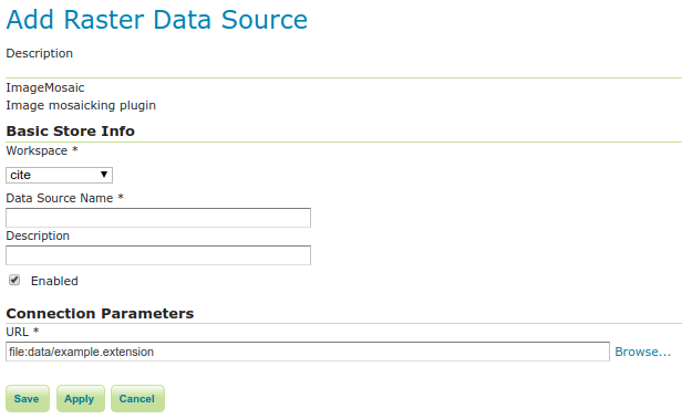 By default, ImageMosaic will be an option in the Raster Data Sources list when creating a new data store.