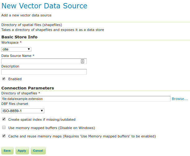 | Enabled | Enables the store. If disabled, no data in any of the shapefiles will be served. |