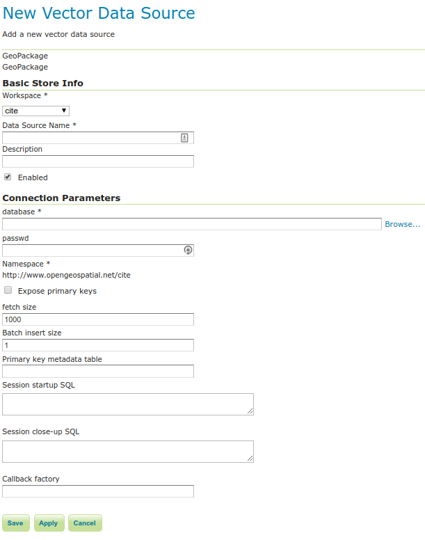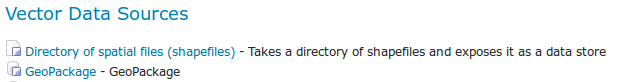 When the extension has been installed, GeoPackage will be an option in the Vector Data Sources list when creating a new data store.