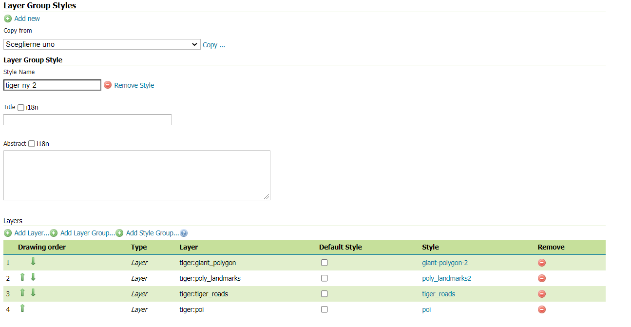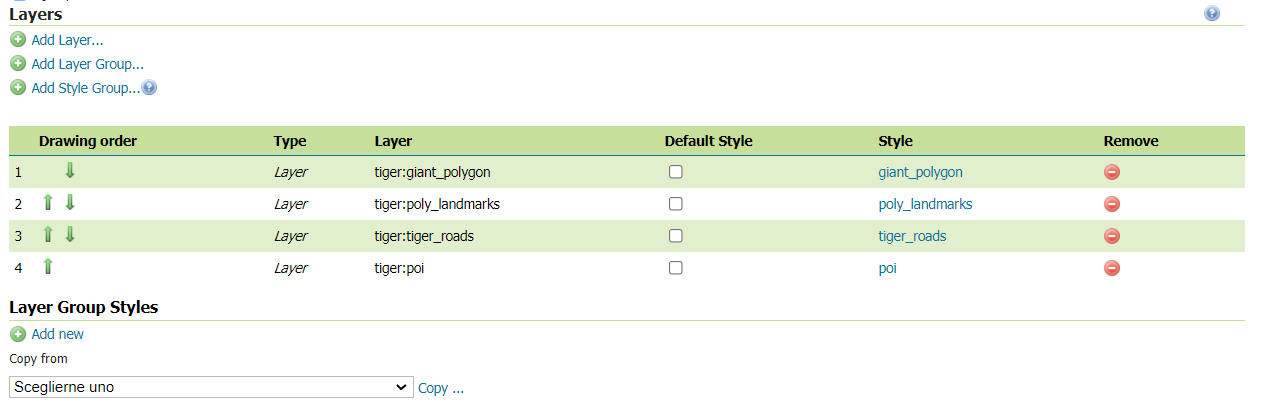 In the above example the style uses the same list of layers, but different styles have been defined for the tiger:giant_polygon and tiger:poly_landmarks layers, respectively giant-polygon-2 and poly_landmarks-2. However the Layer Group Style might also contain a different list of layers comparing to the default one.