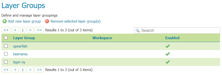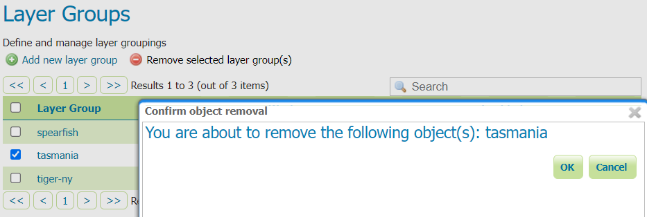 To remove a layer group, select it by clicking the checkbox next to the layer group. Multiple layer groups can be selected, or all can be selected by clicking the checkbox in the header. Click the Remove selected layer group(s) link. You will be asked to confirm or cancel the deletion. Selecting OK removes the selected layer group(s).